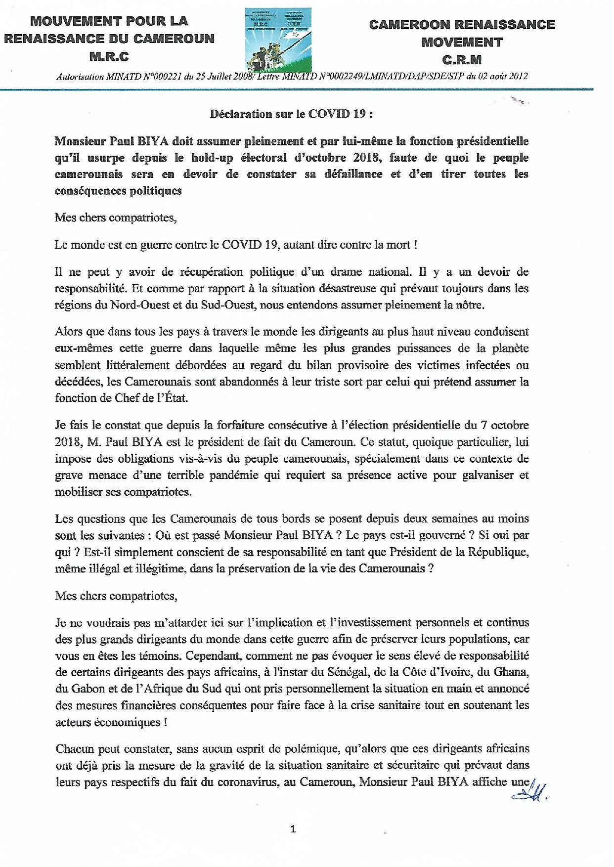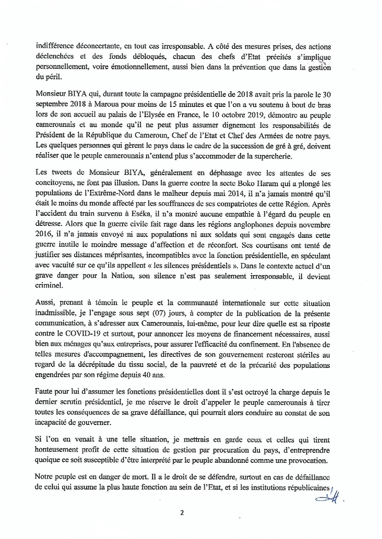 Faute donc pour Monsieur Paul BIYA d’assumer les fonctions présidentielles dont il s’est octroyé la charge depuis le dernier scrutin présidentiel, j’appelle le peuple camerounais à tirer toutes les conséquences de cette grave défaillance; la plus immédiate est son incapacité à conduire personnellement le pays dans la lutte contre le grave danger du Coronavirus, dont on assiste à une progression fulgurante et à ses premières conséquences économiques et sociales.
