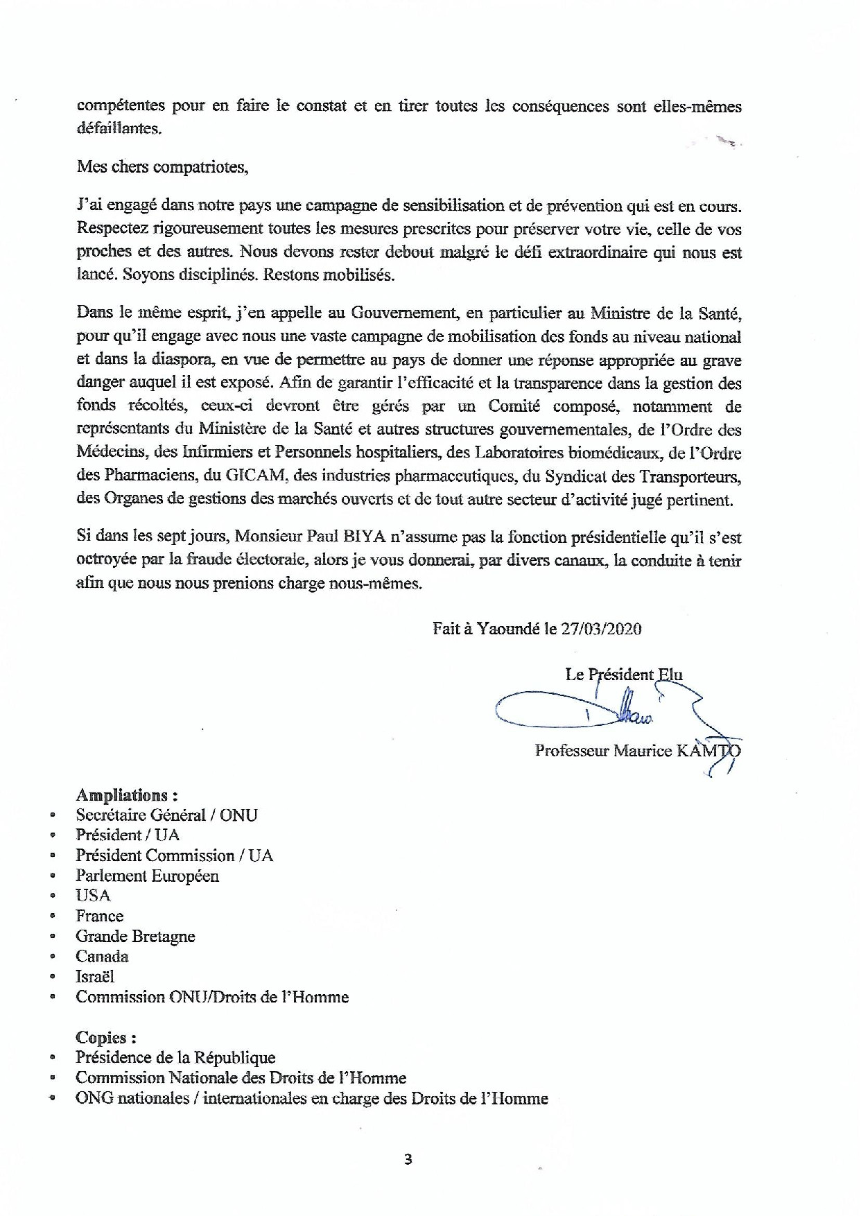 Déclaration du Président Élu Maurice KAMTO du 3 avril 2020 sur la défaillance de Monsieur Paul BIYA, Président de fait de la République du Cameroun