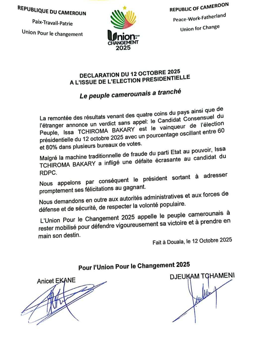 LUnion pour le changement 2025 appelle le peuple camerounais à rester mobilisé pour défendre vigoureusement sa victoire et à prendre en main son destin.