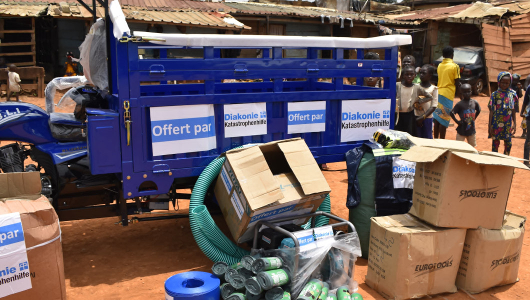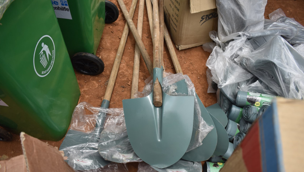Dans la liste du matériel reçu, on retrouve : brosses de rue ; sacs poubelles, cache-nez, pulvérisateurs, tricycle avec toit, motopompes, tuyaux de motopompes, râteaux, machettes, ruban de balisage, savon, lunettes de protection, baramines, pioches, botte, pelles, porte-tout, brouettes, fourche à gazon.