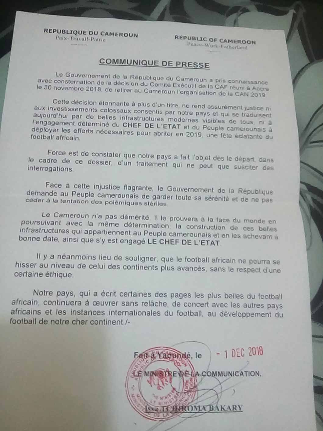 Le gouvernement de la République du Cameroun a pris connaissance avec consternation de la décision du Comité exécutif de la CAF réuni à Accra le 30 novembre 2018, de retirer au Cameroun l’organisation de la CAN 2019.